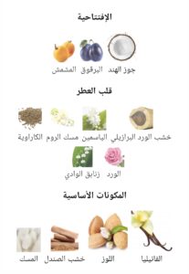 إفتتاحية العطر جوز الهند, البرقوق و المشمش; قلب العطر خشب الورد البرازيلي, الياسمين, مسك الروم, الكاراوية, الورد و زنابق الوادي; قاعدة العطر تتكون من الفانيليا, اللوز, خشب الصندل و المسك.